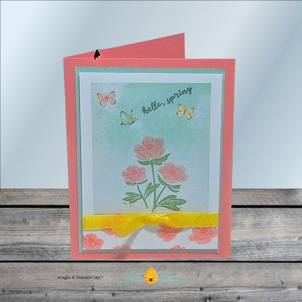 The Darling Duckling Ribbon (165272) adds the perfect pop of contrast. Yellow against coral and soft blue feels bright but not overpowering. Tying it across the lower third of the card grounds the design and adds texture without overwhelming the florals.