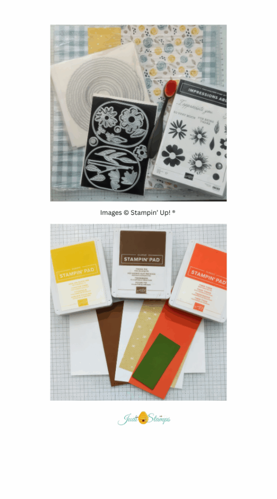 For my project, I leaned into a fall floral card by layering a peachy-orange with rich Timid Tiger and accenting with Pecan Pie. The floral images from Impressions Abloom, paired with the textures of Everyday Happiness DSP, made the design feel like it was gathered straight from a fall bouquet.