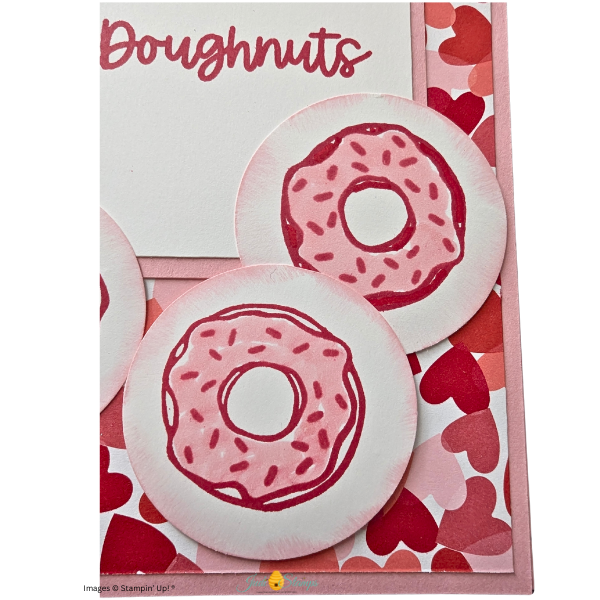 The donuts were stamped in Real Red Classic Ink and then brought to life with Stampin’ Blends for soft shading and added dimension. You don’t need heavy coloring here—just a little blending around the edges gives the donuts a frosted, finished look without overworking the image.