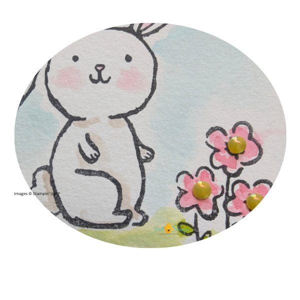For the watercoloring, I used a watercolor brush and pulled ink directly from the lids of my ink pads. Balmy Blue and Gray Granite were used for the bunny, keeping the shading light and subtle. I added Granny Apple Green for the grass and Strawberry Slush for the flowers to bring in small pops of color that tie back to the card base.