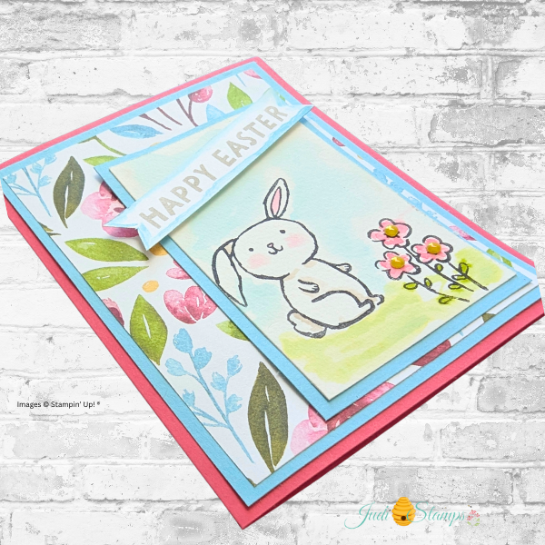 The base of this card starts with Strawberry Slush cardstock, which adds warmth and contrast without overwhelming the design. A layer of Balmy Blue cardstock softens the look and creates a gentle spring color palette. For the focal image, I stamped the bunny from the Easter Basket Stamp Set onto Watercolor Paper, which is essential for this technique. Watercolor paper holds moisture well and allows the ink to move without warping or pilling.
